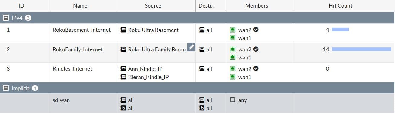 A better way of moving the Roku devices and Kindles to WAN2 with failover to WAN1 is SD-WAN. I could have placed rules for each service on the Roku devices. Instead I choose to setup the Roku and all them to any destination for the 60+ channels.