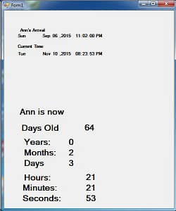 This is the next phase of Ann’s age clock. It refreshed every 250ms. It calcuates her age down to seconds. The next phase of this will be figuring out how to get it into ASP.NET.